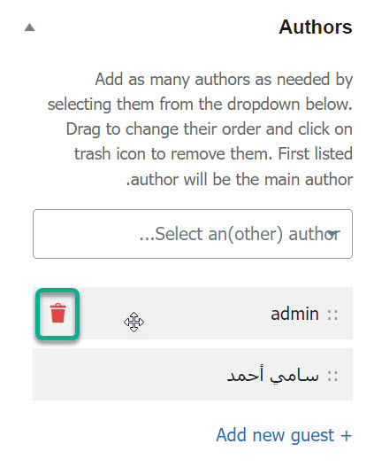 لكن يمكنك إزالة اسم المؤلف الذي أدرج التدوينة في الموقع وإبقاء اسم المؤلف الضيف الذي أضفته عن طريق النقر على أيقونة السلة التي تظهر بجانب اسم المؤلف الذي أدرج التدوينة عند تمرير مؤشر الفأرة عليه.