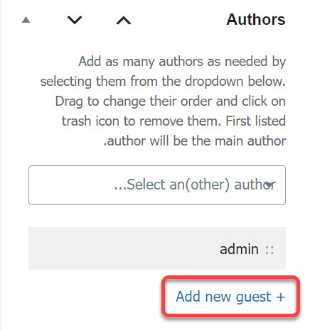لعرض اسم الضيف كمؤلف للمقالة، قم بالنقر على (Add new guest). سيتم توسيع قسم (Authors) عن طريق إظهار جزء صغير باسم (Quick Add New Guest). يتضمن هذا الجزء حقلًا عليك أن تقوم بكتابة اسم الضيف فيه، وزر (Add) عليك أن تنقر عليه ليتم إنشاء حساب ضيف باسم الضيف (الذي كتبته في الحقل).