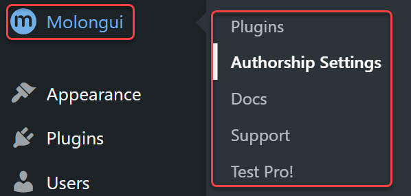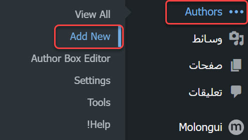 بعد تنصيب إضافة Molongui Authorship على موقعك، سيتم إضافة تبويب باسم (Molongui) إلى القائمة الجانبية للواجهة الخلفية للووردبريس، وسيتضمن هذا التبويب قائمة منسدلة تحوي مجموعة من الخيارات.