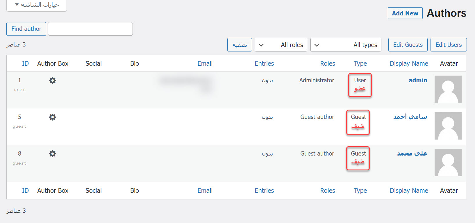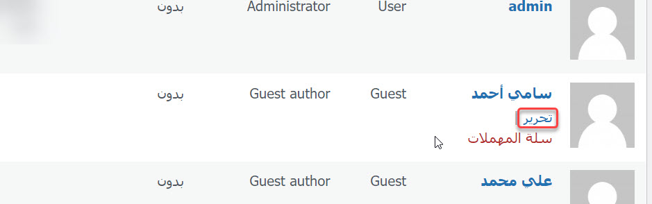 لفعل ذلك عليك الانتقال إلى صفحة تعديل البروفايل الخاصة بحساب الضيف عن طريق النقر على كلمة (تحرير) التي تظهر أسفل اسم الحساب عند تمرير مؤشر الفأرة عليه في صفحة (Authors).