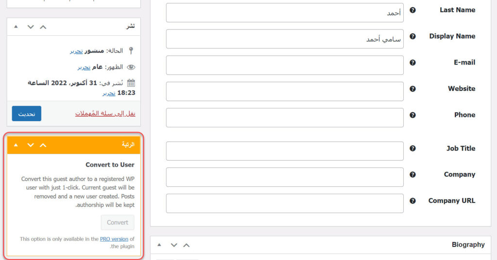 كما يمكن أيضًا تحويل حساب الضيف إلى حساب عضو ووردبريس من صفحة تحرير البروفايل نفسها من أجل أن يتمكن الضيف من تسجيل الدخول، لكن هذه الميزة لا تتوفر في النسخة المجانية ويتوجب عليك الترقية للاستفادة منها.