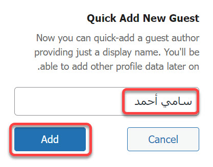 بعد أن تنقر على زر (Add)، سيكون قد تم إنشاء حساب ضيف بالاسم الذي حددته، وإضافته كمؤلف للتدوينة قيد التحرير، لكن لأن الإضافة تقوم بتفعيل ميزة المؤلفين المتعددين على الموقع أيضًا، سيتم إضافة اسم الضيف كمؤلف مع إبقاء اسم المؤلف الأصلي (أي اسمك أو اسم المؤلف الذي أدرج التدوينة في الموقع)، وبالتالي سيصبح لديك مؤلفان للمقالة، وسيظهر الاسمان في الواجهة الأمامية للموقع.