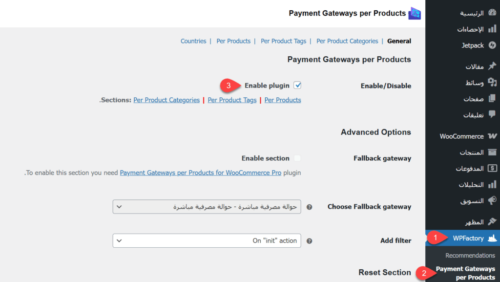 بعد التنصيب والتفعيل توجهت إلى إعدادات الإضافة من خلال الانتقال إلى WPFactory ثم Payment Gateways per Products، وفعلت خيار Enable plugin في تبويب General.