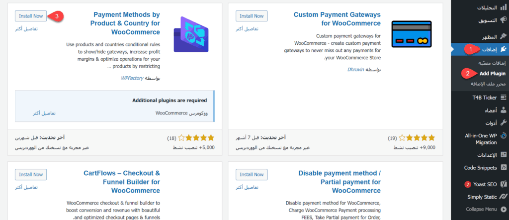 بداية توجهت إلى إضافات > إضافة جديد (Add Plugin)، ثم أدخلت اسم الإضافة في حقل البحث، ونقرت على زر التنصيب الآن (Install Now) الخاص بها، ثم نقرت على زر التفعيل (Activate).
