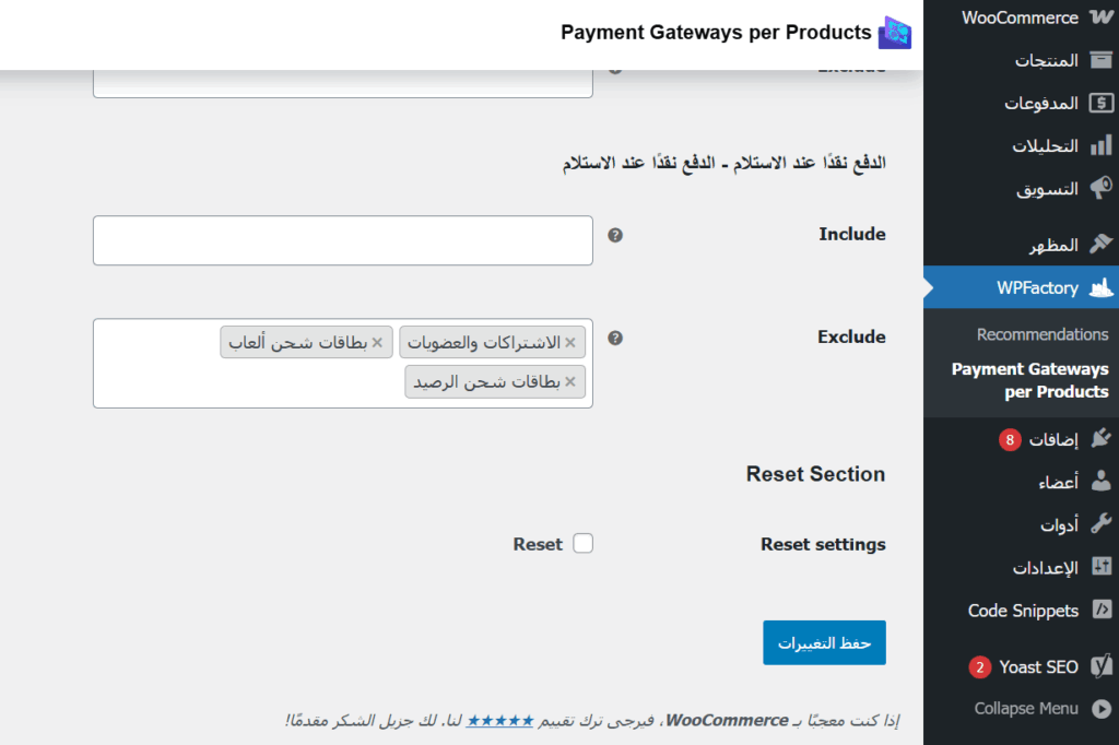 بعد ذلك انتقلت إلى تبويب Per Product Categories، وتأكدت أن خيار Enable section مفعل، وأدخلت في حقل Exclude الخاص ببوابة الدفع عند الاستلام تصنيفات المنتجات الرقمية حيث سيؤدي ذلك إلى منع ظهور البوابة عند احتواء السلة على منتج يحمل أحد هذه التصنيفات، ثم نقرت على زر حفظ التغييرات.