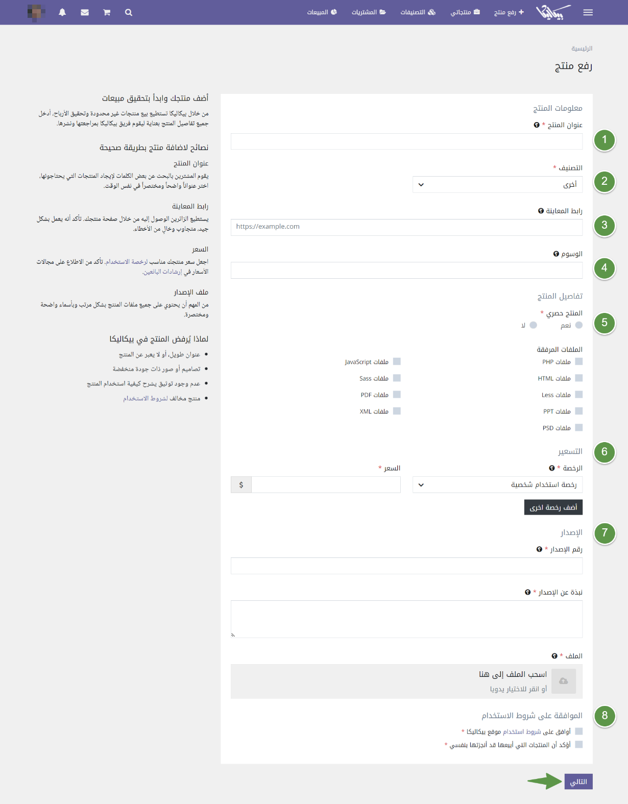 ستقوم برفع المنتج بسهولة بكتابة بياناته بشكل كامل من عنوان المنتج ورابط المعاينة ونوع الرخصة.. إلى آخر المعلومات ثم تقوم بنشره في المتجر.