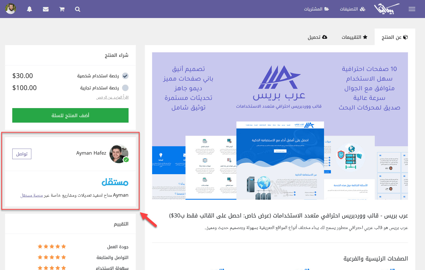كذلك سيكون هناك الفرصة لتوسيع قاعدة عملائك لأن المتجر يتيح خاصية تنفيذ مشاريع خاصة مع المطور على موقع مستقل، فمثلًا إذا أشترى العميل أحد القوالب ويريد عمل تعديل مخصص للقالب فبإمكان العميل ذلك من خلال النقر على زر (تنفيذ تعديلات ومشاريع خاصة على مستقل).