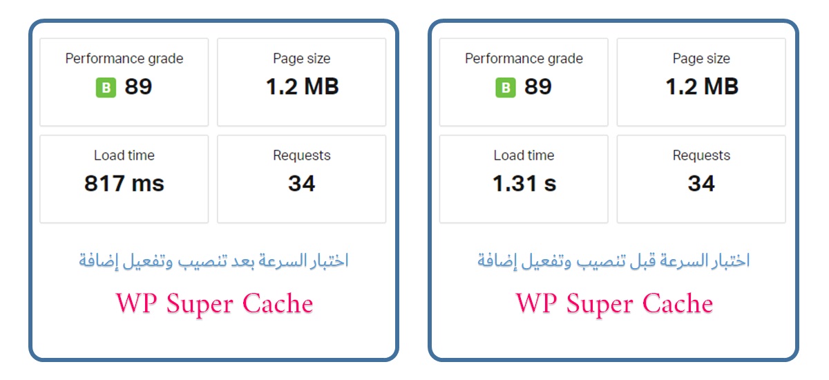 بعد ذلك قمنا بتنصيب إضافة WP Super Cache وقمنا بتفعيلها، ثم أعدنا اختبار سرعة الصفحة نفسها عدة مرات، فلاحظنا اختلافًا كبيرًا في وقت التحميل، إذ حصلنا على أرقام كان أكبرها مساويًا لـ 817 ميلي ثانية، وهذا يعني أننا خفضنا وقت التحميل بنسبة 35%، وهذه نسبة كبيرة وتفيد كثيرًا موقع الووردبريس.