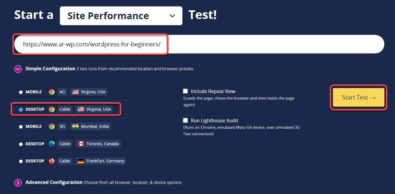 كذلك من السهل أيضًا استخدام الأداة لقياس السرعة، إذ ليس عليك إلا أن تقوم بإدخال رابط موقعك الووردبريس أو رابط إحدى صفحاته، ثم تحدد خيارات الفحص (مثل المتصفح والجهاز ونوع الاتصال بالإنترنت)، ثم تنقر على زر (Start Test) لتبدأ عملية الفحص وتنتهي خلال ثوانٍ قليلة (ربما تنتظر أيضًا عدة ثوان قبل بدء الفحص إذا كان هناك ضغط على الأداة).