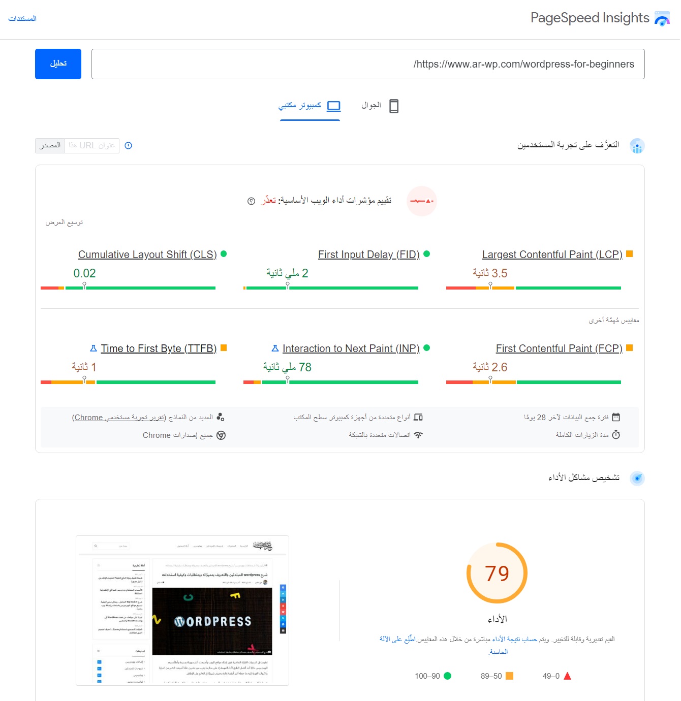 تعد أداة Google PageSpeed Insights واحدة من أفضل أدوات قياس سرعة موقع الووردبريس، إذ توفر الأداة قيم مجموعة من المقاييس المتعلقة بالسرعة، بما فيها LCP و FID و FCP و TTFB و INP و CLS، وبناء على بعض تلك القيم وغيرها تعطي الأداة تقييمًا للصفحة بين 1 و 100 يعبر عن سرعتها وأدائها بشكل عام، وكلما كان أداء الصفحة أفضل كلما ازداد تقييمها.