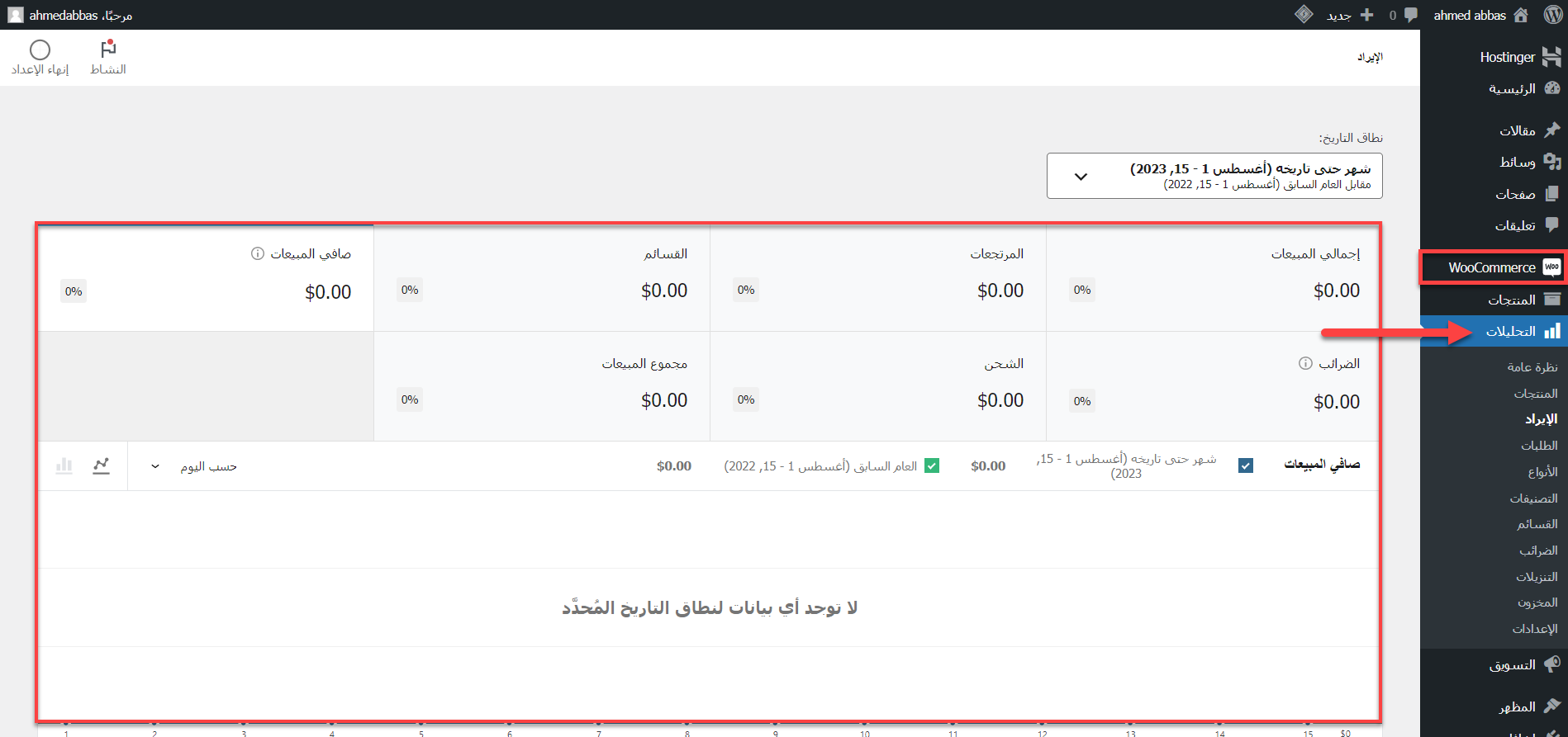 ويمكنك الحصول على تقارير المبيعات بشكل مباشر بواسطة أداة Woocommerce Analysis حيث تقوم بالدخول إلى لوحة الووردبريس الرئيسية ثم تختار التحليلات Analysis من القائمة الجانبية ومنها تختار الإيرادات Revenue وذلك كما موضح في الصورة التالية: