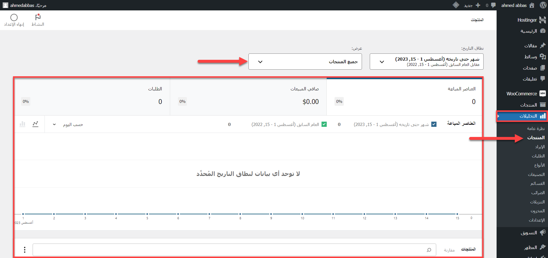 ويمكنك الحصول على تقارير المبيعات أيضًا من خلال Woocommerce Analysis أيضًا عن طريق الوصول إليها من لوحة تحكم الووردبريس الرئيسية ثم تختار المنتجات وتبدأ في تحديد عرض التقرير لمنتج واحد مع تحديد المنتج أو العرض لكافة المنتجات وذلك كما موضح في الصورة التالية: