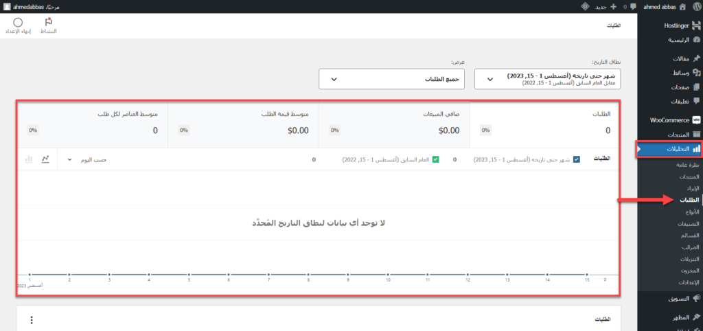 وتستطيع عرض تقارير الطلبات خلال Woocommerce Analysis أيضًا وذلك عن طريق الوصول إليها من لوحة تحكم الووردبريس كما فعلنا في التقارير السابقة وذلك كما موضح في الصورة التالية: