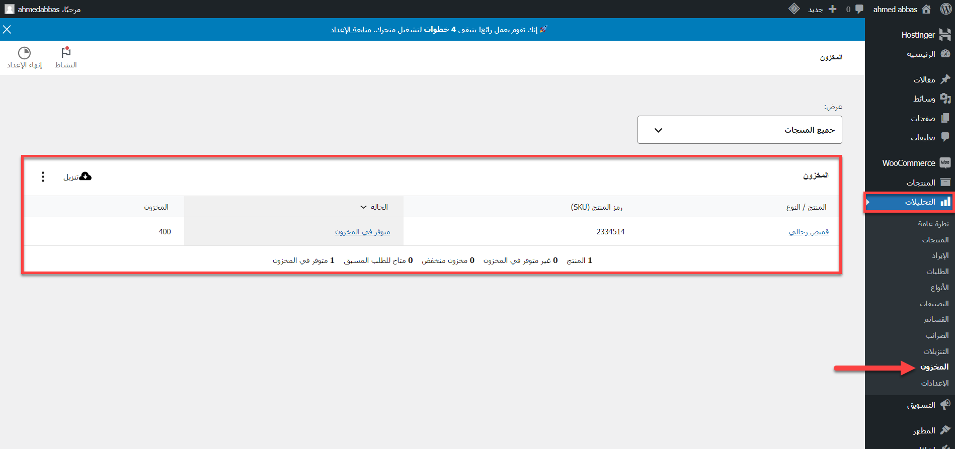 وتستطيع الاعتماد على Woocommerce Analysis في تجهيز تقارير المخزون أيضًا وذلك عن طريق الوصول إليها كما فعلنا في الخطوات السابقة ولكن يتم اختيار المخزون وذلك كما موضح في الصورة التالية: