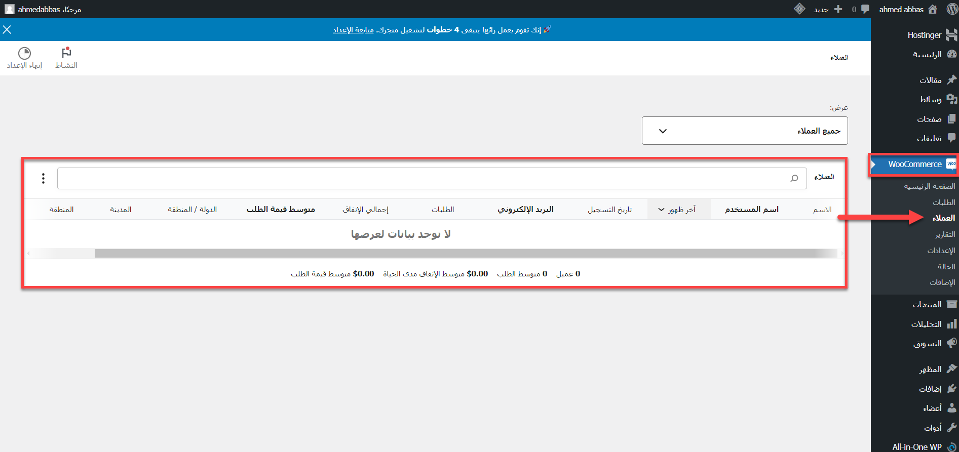 وكذلك بالنسبة لتفاصيل العميل يمكنك الحصول عليها بشكل مباشر من تقارير ووكومرس حيث تقوم بالدخول إلى لوحة الووردبريس الرئيسية ومنها تختار Woocommerce وبعد ذلك العملاء وذلك كما موضح في الصورة التالية: