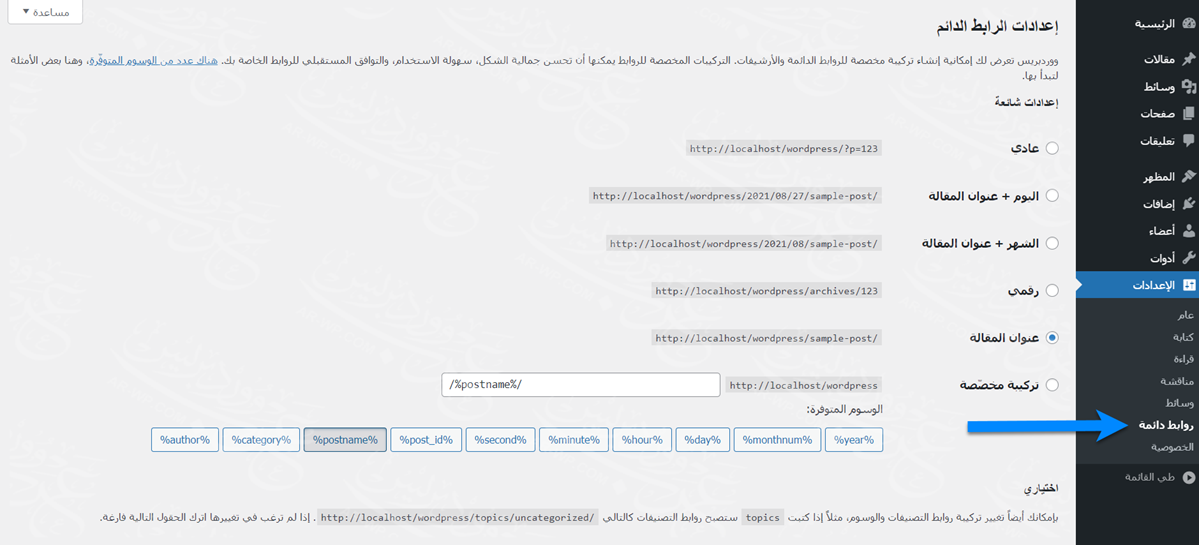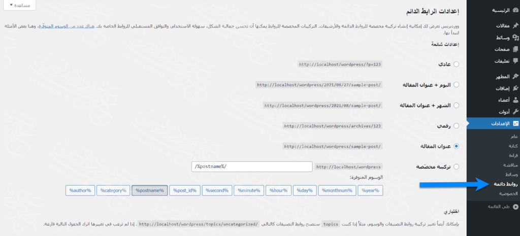 ولكي تستطيع إعداد هذه الروابط اذهب إلى صفحة الإعدادات وابحث عن قائمة الروابط الثابتة Permalinks، وتحقق من الإعدادات العامة واختر أفضل ما يناسبك، ولاحظ أن وجود اسم المنشور أو الصفحة في الروابط الثابتة يساعد في تحسين محركات البحث الخاصة بموقعك الإلكتروني.