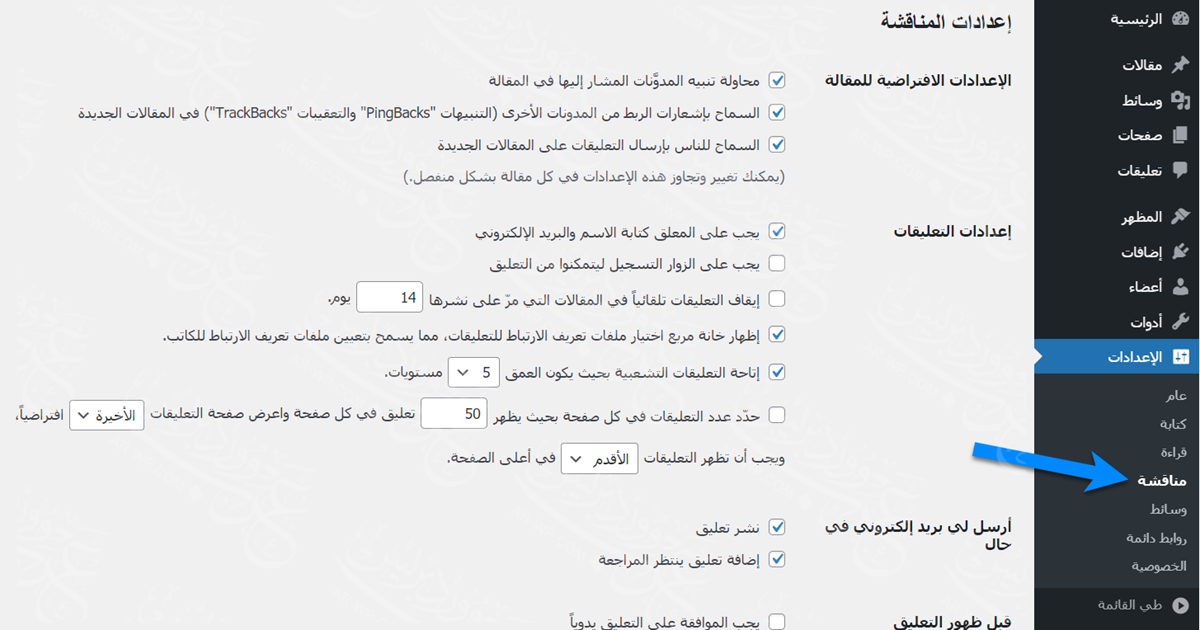 ولإعداد هذه الخاصية على موقع الووردبريس الخاص بك يمكن الضغط على الإعدادات من القائمة الرئيسية، ثم الضغط على مناقشة أو Discussion وسوف تظهر لك واجهة خاصة بها تستطيع من خلالها تفعيل التعليقات وإعداد الإشعارات وتمكين الإشراف على التعليقات وغير ذلك من الخيارات.