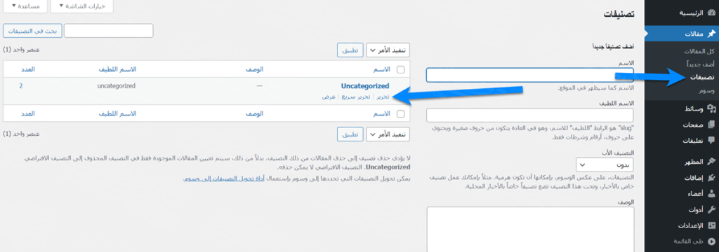 ولتغيير اسم هذه الفئة اضغط على قائمة المقالات أو Posts ثم اضغط على تصنيفات Categories وحرك مؤشر الماوس على غير مصنف أو Uncategorized واضغط على تحرير أو Edit، سوف تظهر لك قائمة جديدة تستطيع من خلالها تغيير اسم الفئة أو التصنيف وكذلك تغيير الاسم اللطيف أو Slug وكذلك وضع وصف لهذه الفئة ثم اخيراً اضغط على تحديث.