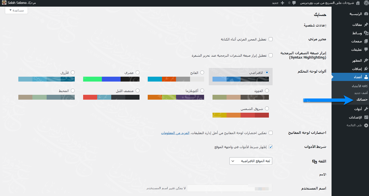 يجب تحديث البروفايل الخاص بك، وذلك عن طريق الانتقال إلى الأعضاء Users واضغط على ملف التعريف الخاص بك Your Profile أو حسابك، وهنا يمكنك اختيار كيفية عرض اسمك على الموقع وعنوان البريد الإلكتروني الذي سيتم استخدامه لإشعارات الموقع، كما يمكنك تحديث كلمة المرور الخاصة بك.