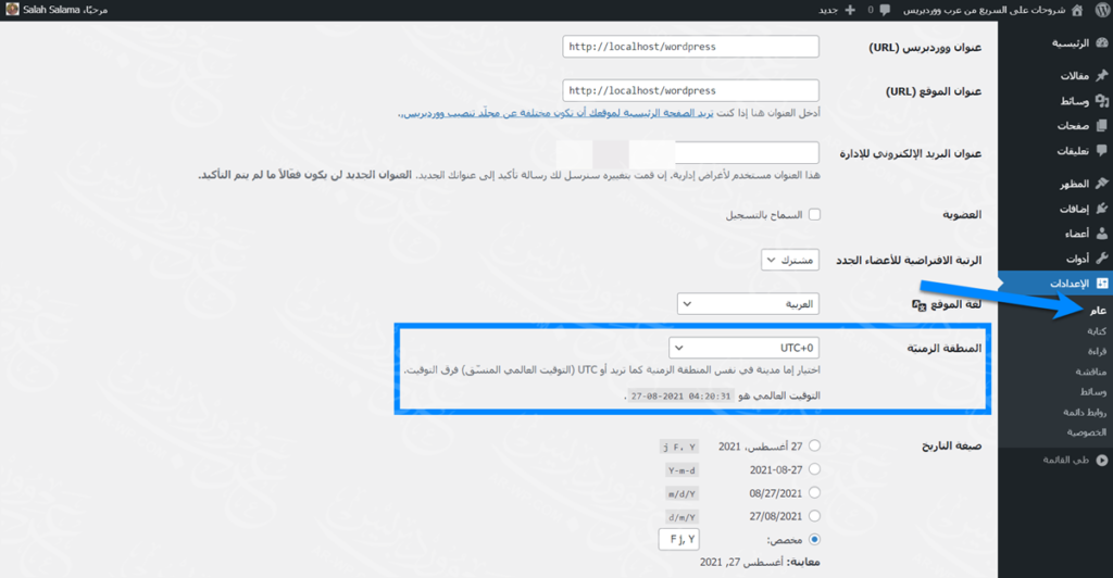 أيضاً من قائمة الإعدادات اضغط فوق عام General وتأكد من ضبط المنطقة الزمنية المحلية على موقعك، وسوف يضمن هذا صحة التوقيت عند جدولة المنشورات Schedule Posts ليتم نشرها أو الأحداث المجدولة مثل النسخ الاحتياطية.