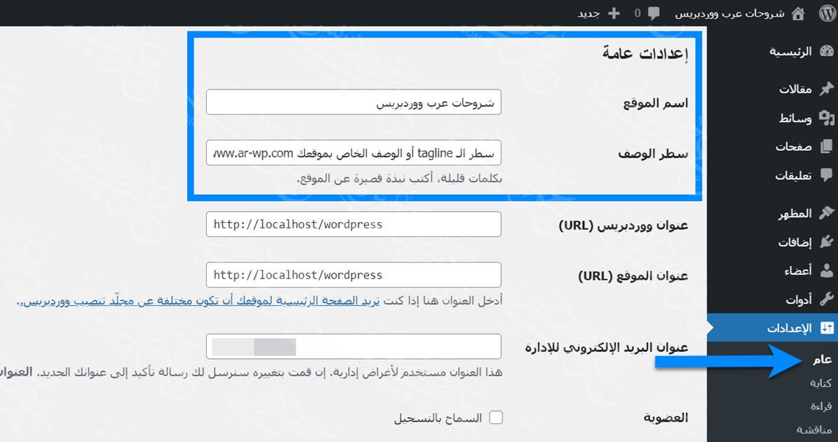 ويتم تغيير سطر الوصف واسم الموقع من خلال (WordPress general settings) والتي تذهب لها من القائمة الرئيسية ثم الضغط على الإعدادات Settings، واختيار عام General، وفي هذه القائمة تستطيع تغيير الإعدادات العامة الخاصة بموقعك مثل اسم الموقع، سطر الوصف، لغة الموقع، المنطقة الزمنية Time zone وغيرها.
