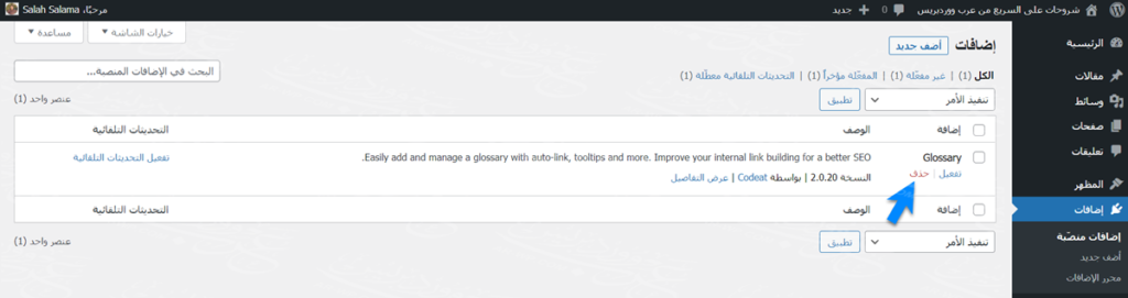 أما بالنسبة لطريقة حذف الإضافات Plugins فعن طريق الضغط عليها سوف تفتح لك قائمة بجميع الإضافات التي قمت بتثبيتها تستطيع تحديد الإضافة التي تريد حذفها واختيار أمر حذف من شريط الأدوات في الأعلى ثم الضغط على أيقونة المربع الصغير الموجود بجوار الإضافة التي تريد حذفها وأخيراً الضغط على تطبيق.