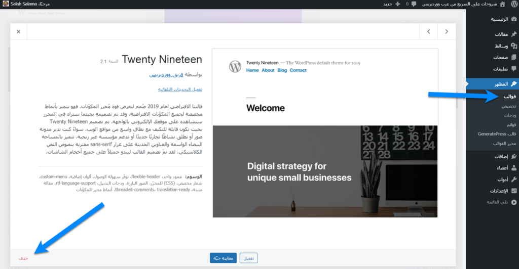 وطريقة حذف القوالب والإضافات سهلة جداً، وذلك بالنسبة للقوالب من خلال القائمة الرئيسية ووضع مؤشر الماوس على المظهر أو Appearance والضغط على القوالب ثم اضغط على القالب الذي تريد حذفه وسوف يفتح لك واجهة بسيطة للقالب وتجد خيار الحذف في الركن الأيسر.