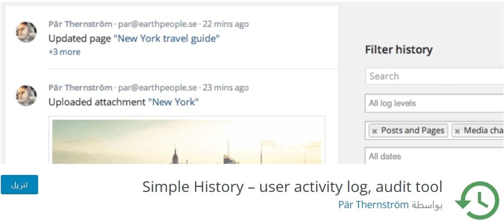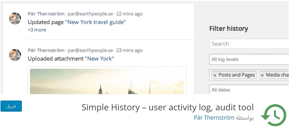 تسمح لك إضافة Simple History بمتابعة كافة التغييرات التي يقوم بها مستخدمو لوحة التحكم الآخرين، حيث إنها تقوم بإنشاء سجل بكافة التغييرات التي يتم القيام بها، بما في ذلك نشر المقالات، إضافة التعليقات، أو التعديل على الإضافات أو حتى علميات تسجيل الدخول.