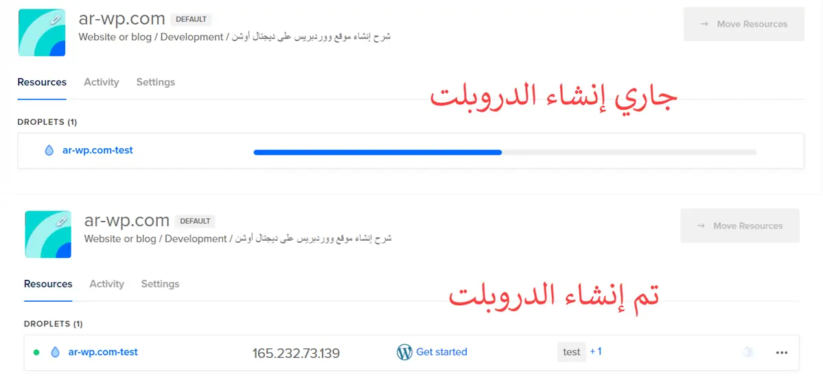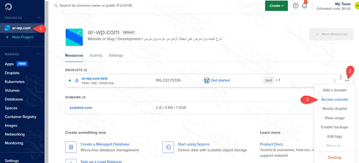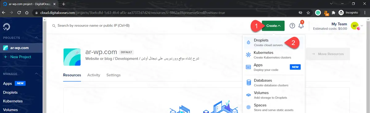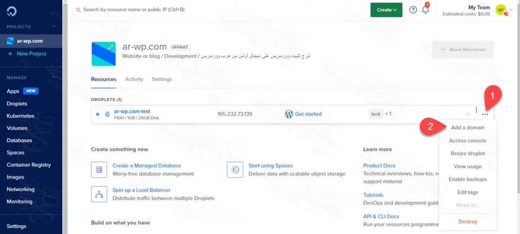 - أعلى اليسار ستجد أن لدى مشروع واحد في ديجتال أوشن بعنوان ar-wp.com، وبداخل هذا المشروع يوجد دروبلت واحد فقط بعنوان ar-wp.com-test.