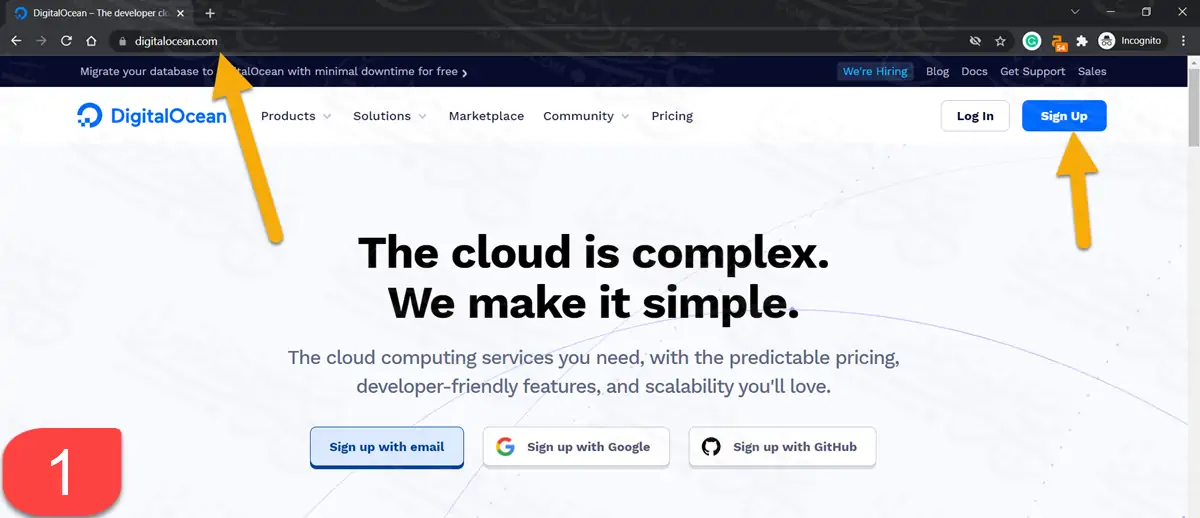 توجه إلى موقع Digital Ocean وأضغط من الصفحة الرئيسة على زر Sign up لبدء تسجيل حساب جديد على الموقع.