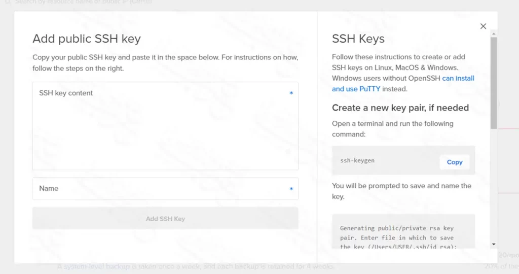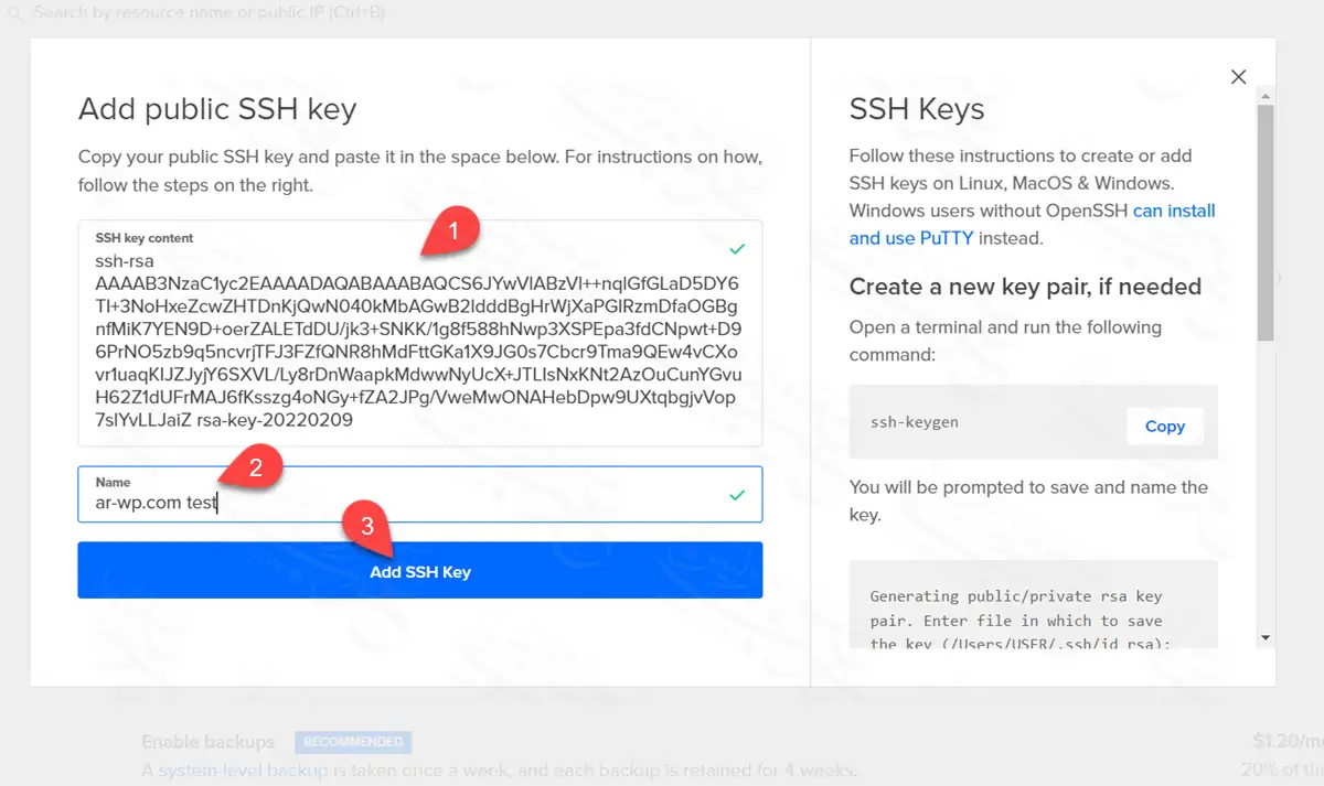 - في خانة Name اكتب أي اسم معبر عن المفتاح كي تتذكر لماذا وضعته في ديجتال أوشن.