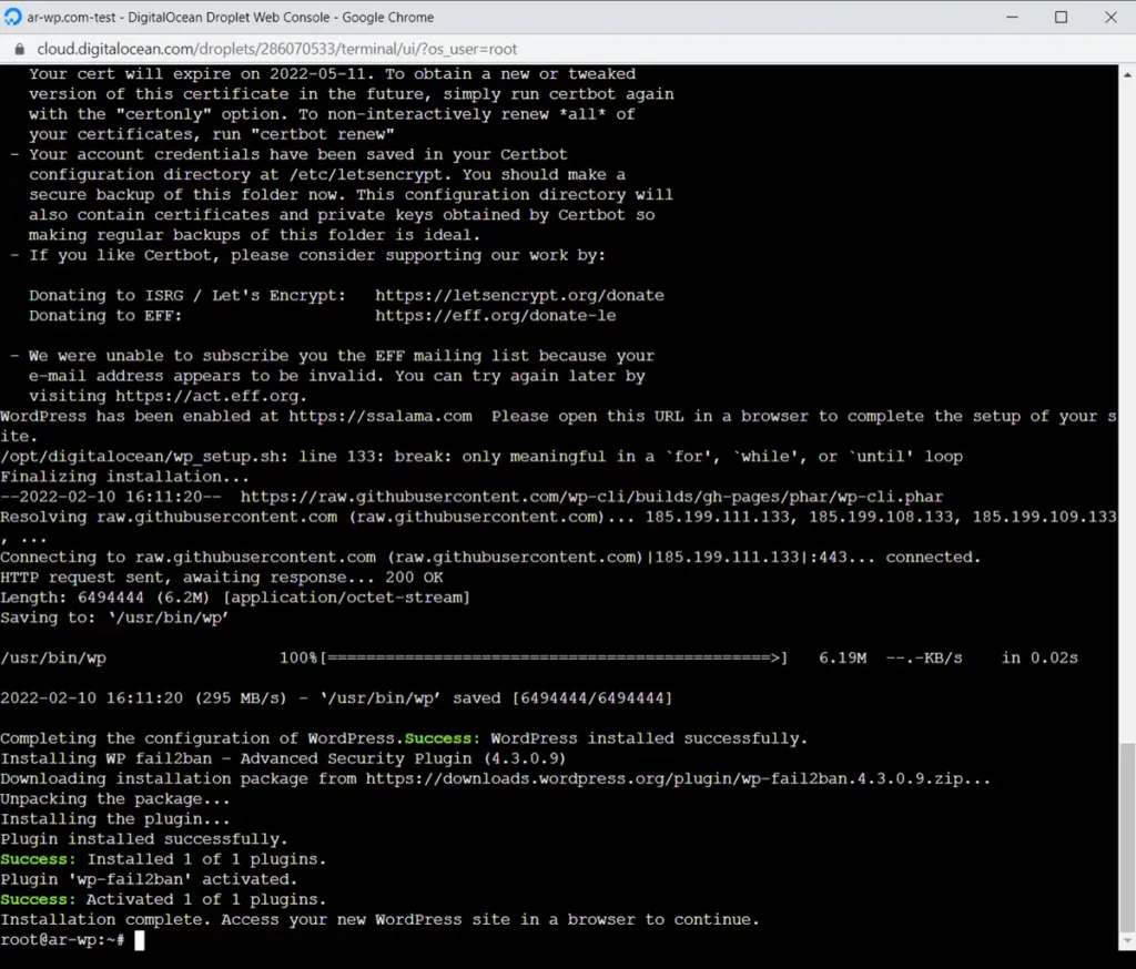 الآن سوف تنتظر ثواني معدودة حتى يتم تثبيت شهادة الأمان للموقع، وستعرف عندما يكتب لك installation complete.