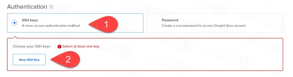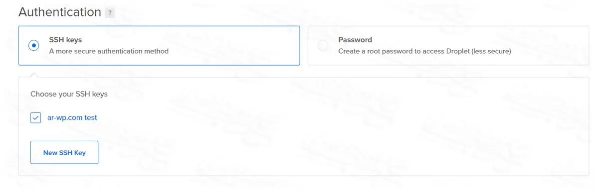 أما النظام الأول SSH Keys فهو الاختيار الأفضل والأكثر أمانًا وحماية؛ وذلك لأن التسجيل بهذه الطريقة سيتطلب منك وجود ملف مشفر (المفتاح الخاص) موجود على جهازك أنت فقط، ولن يتمكن أي شخص من الدخول للسيرفر دون هذا المفتاح.