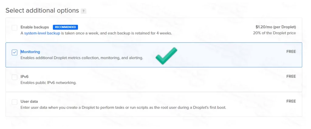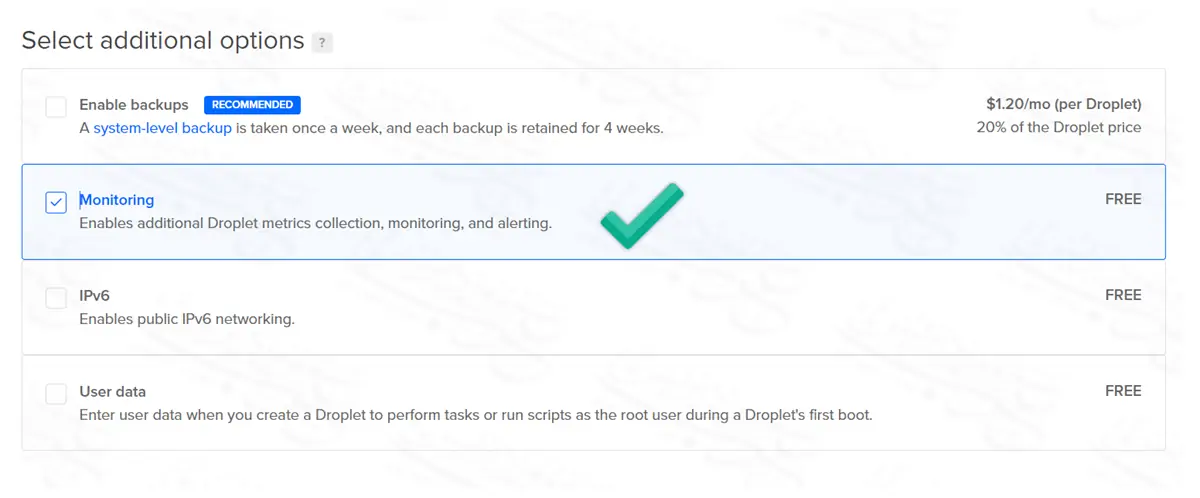 الخيارات الثلاثة الأخرى بالمجان، وأهم خيار منهم هو خيار Monitoring لمتابعة إحصائيات السيرفر الخاص بك، كما يمكنك إضافة IPv6 إذا أردت.