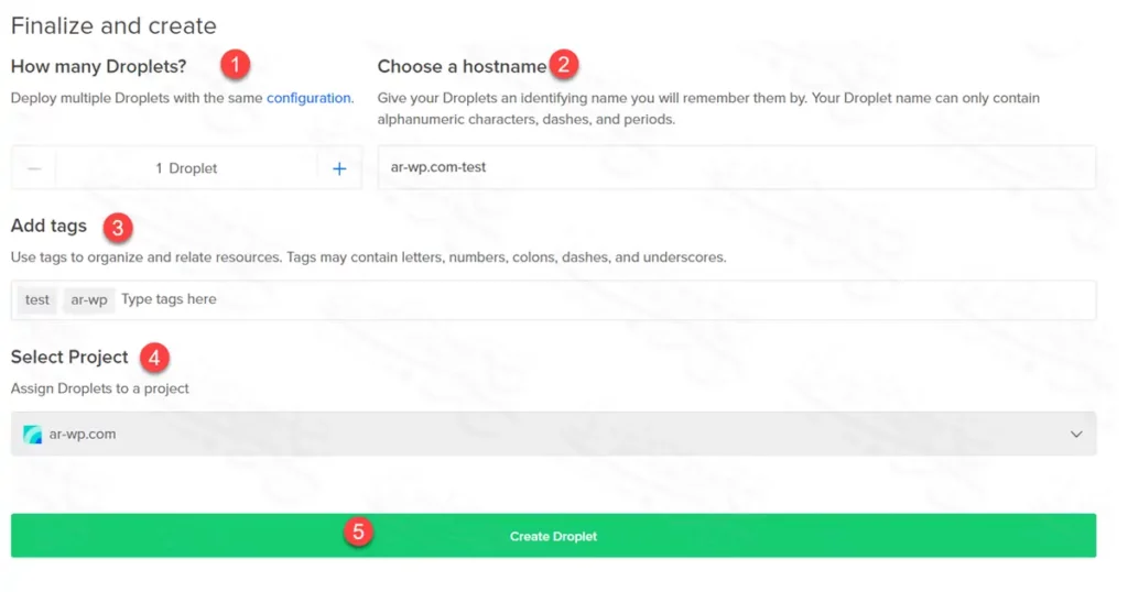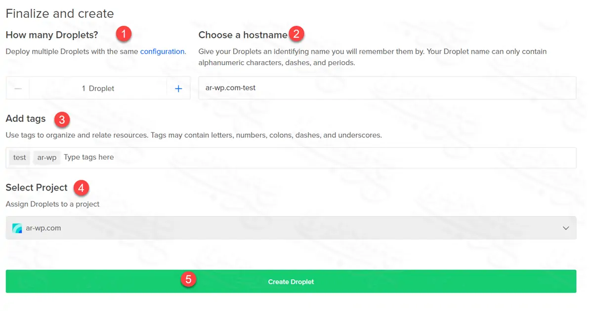 - بعد أن تتأكد من كل الإعدادات السابقة، اضغط على Create Droplet لبدء إنشاء الدروبلت، وفي ثواني معدودة، سيتم إنشاء الدروبلت الخاص بك.