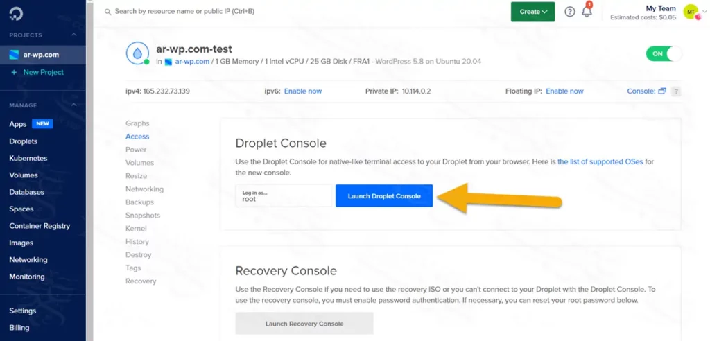 يمكنك تنفيذ هذه الخطوات اعتمادًا على برامج الاتصال بالسيرفر مثل برنامج putty، ولكن لأن هذه الخطوات تنفذ لمرة واحدة فقط فسأنفذها مباشرة من الكونسول الموجودة داخل دروبلت الديجتال اوشن Droplet Console. فقط اتبع الخطوات التالية: