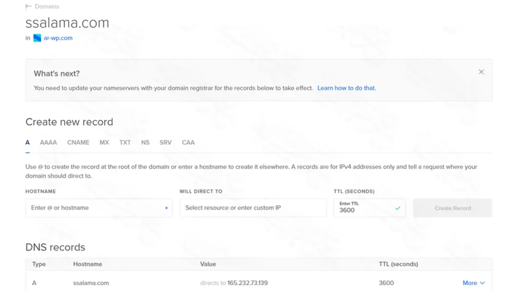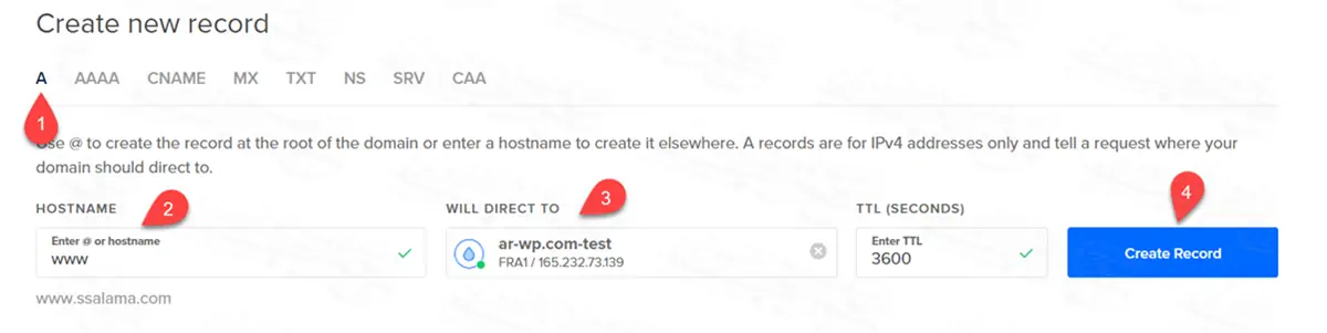 مطلوب منك فقط إنشاء ريكورد جديد من جزئية Create new record، وهذا الريكورد نوعه A من أجل تفعيل الـ www مع الدومين.