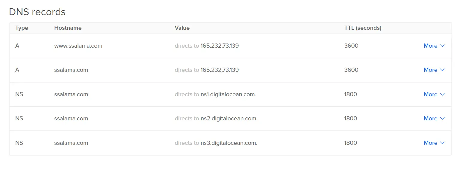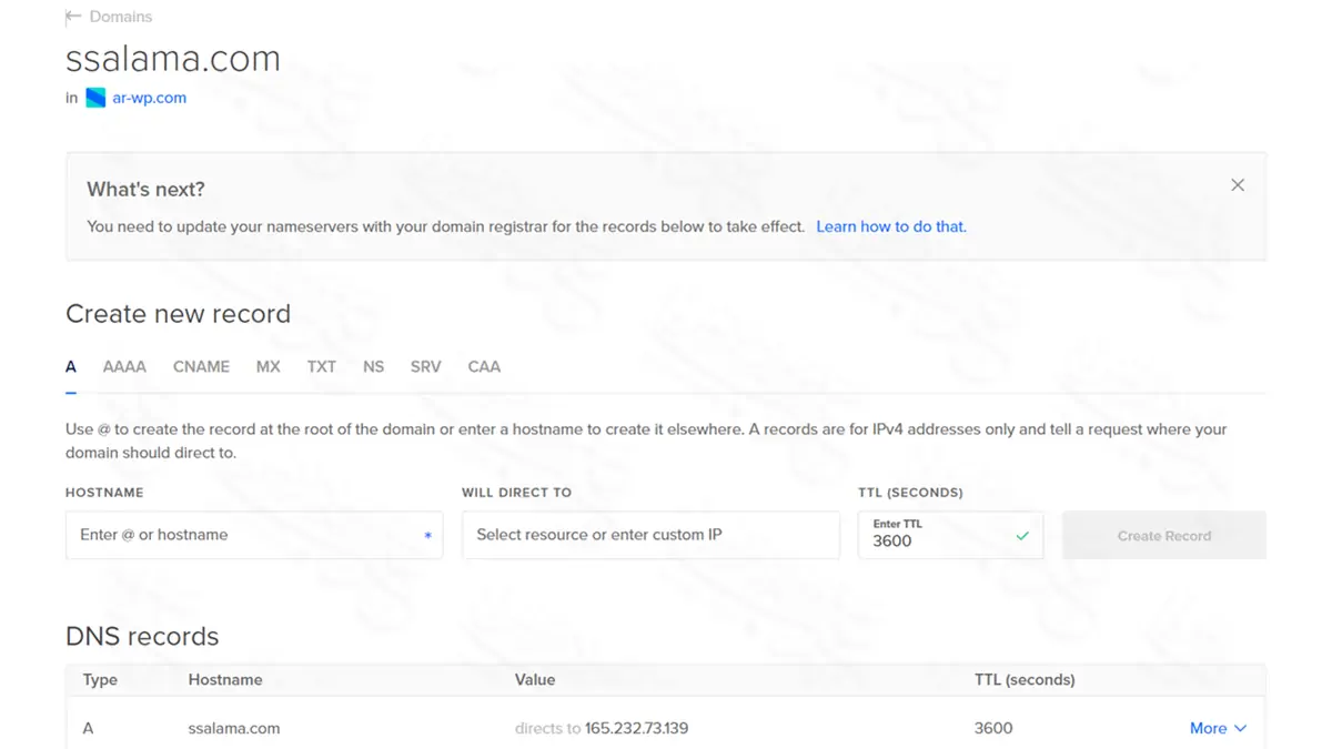 سيتم إضافة الدومين وإعدادات الـ DNS الخاصة به وسيتم تحويلك مباشرة إلى صفحة بها إعدادات الدومين داخل ديجتال أوشن، وهي كما ترى في الصورة السابقة مقسمة إلى قسمين قسم يمكنك من خلاله إنشاء ريكوردات جديدة Create new record، وقسم به DNS records المتضمن لكافة الريكوردات المسجلة للدومين.