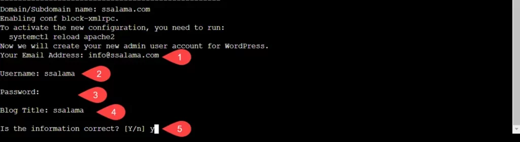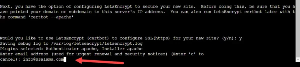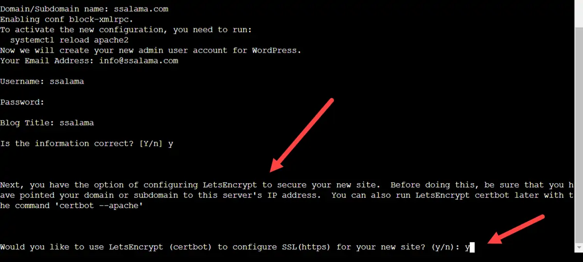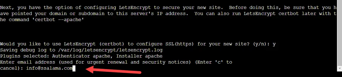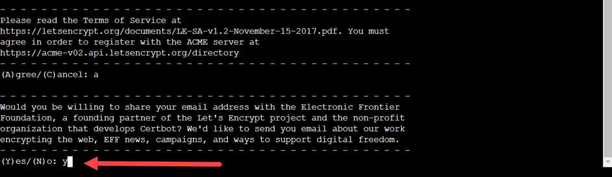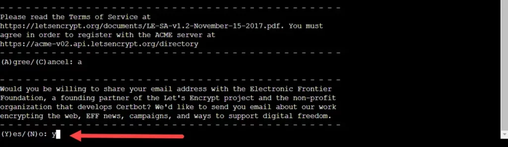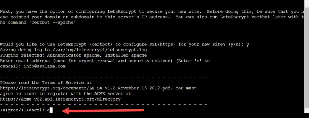 إذا كنت لا تريد تفعيل شهادة الأمان فاكتب n للتعبير عن الرفض ونحن لا ننصحك بذلك؛ لأن شهادات الأمان ضرورية للغاية. ونظرًا لتلك الأهمية سأوافق على إعداد شهادة الأمان عبر Lets Encrypt لأنني لا أنوي شراء شهادة أمان مدفوعة حالية؛ لهذا السبب ستجدني كتبت y في الصورة أعلاه للتعبير عن الموافقة.