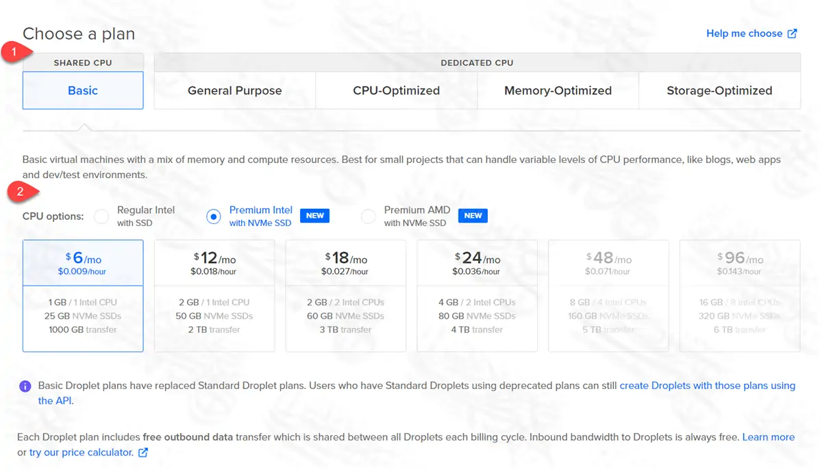 أما المربعات الظاهر فيها الأسعار، فهي توضح مكونات السيرفر والسعر الذي ستدفعه شهريًا. فمثلا أول اختيار ناحية اليسار بقيمة 6 دولار، مكوناته هي: