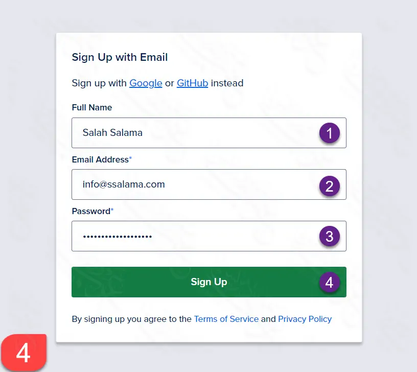 بما أنني اخترت التسجيل باستخدام البريد الإلكتروني، فقد تم فتح نموذج التسجيل كما ترى أعلاه، ومطلوب منك كتابة اسمك بالكامل والبريد الإلكتروني الخاص بك، واختر كلمة مرور مناسبة وقوية ثم أضغط على زر Sign up الملون بالأخضر.