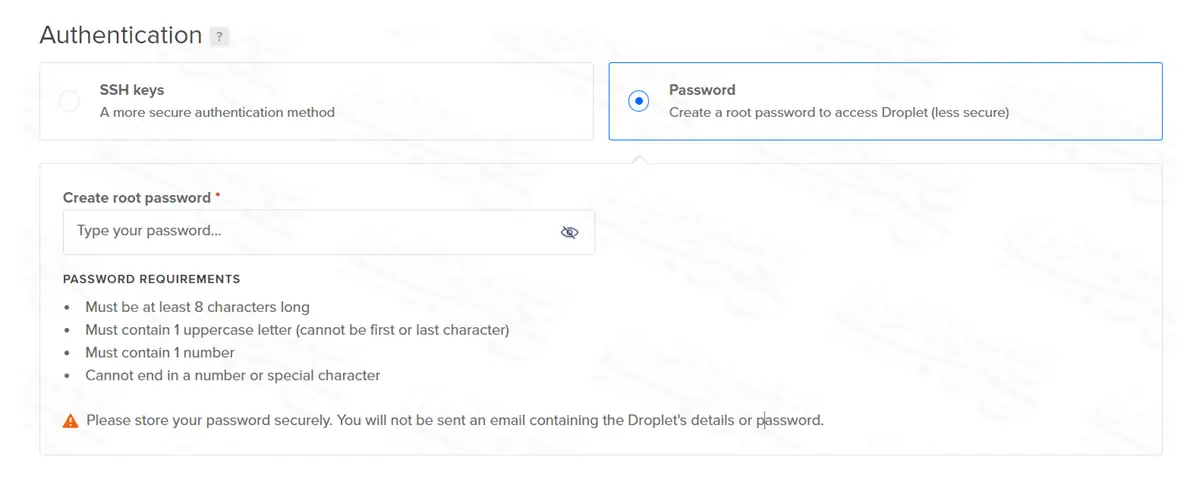 النظام الثاني Password هو الاختيار الأقل حماية لأن الفاصل بين أن يدخل سيرفرك أحد المتطفلين هو كلمة المرور؛ وهذا قد يُعرض سيرفرك لهجمات القوة الغاشمة.