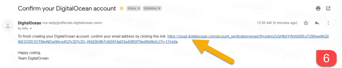 الآن يريد موقع Digital Ocean أن يتأكد أن البريد الإلكتروني الخاص بك صحيح، ولذلك يُخبرك في الخطوة السابقة أنه أرسل رابط في رسالة بريدية وعليك الضغط على هذا الرابط للتأكيد.