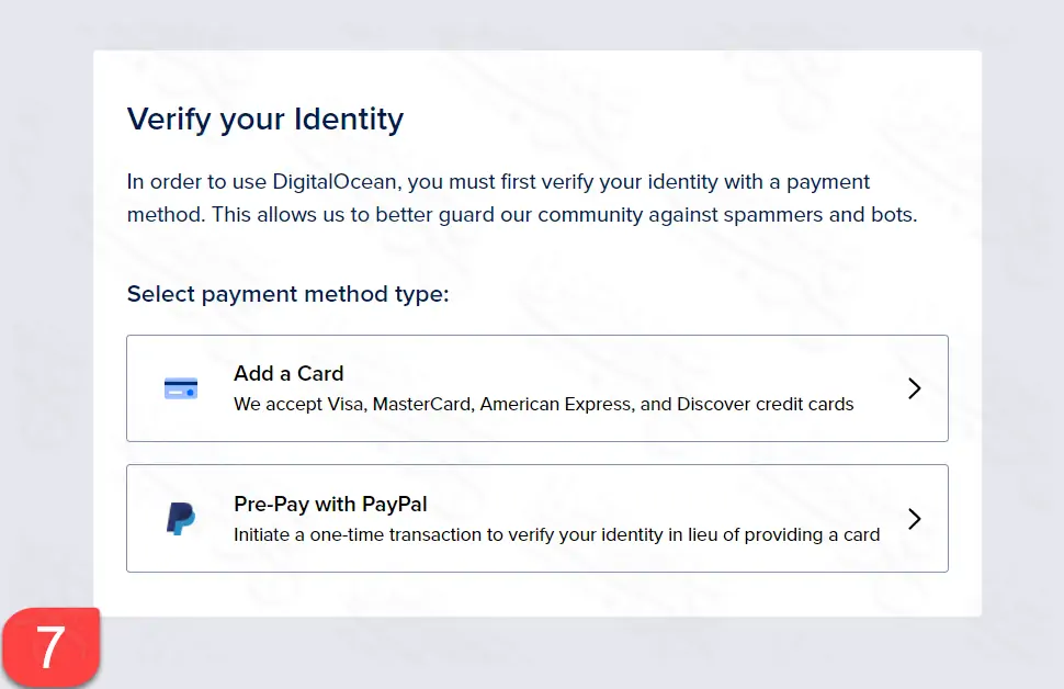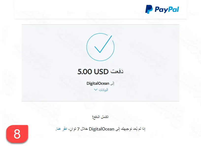 عن نفسي، اخترت أن أدفع باستخدام PayPal كي أتحكم في الدفعات التي يتحصل عليها Digital Ocean مني لأني استخدم الحساب للتجربة فقط، وسألغيه في أقرب وقت. وكما ترى بالصورة أعلاه الحد الدنى للدفع هو 5 دولار فقط.