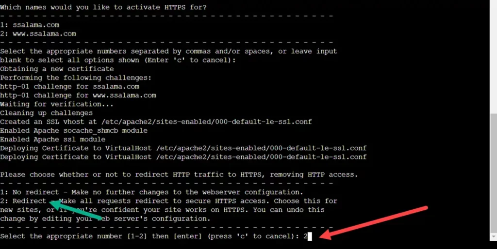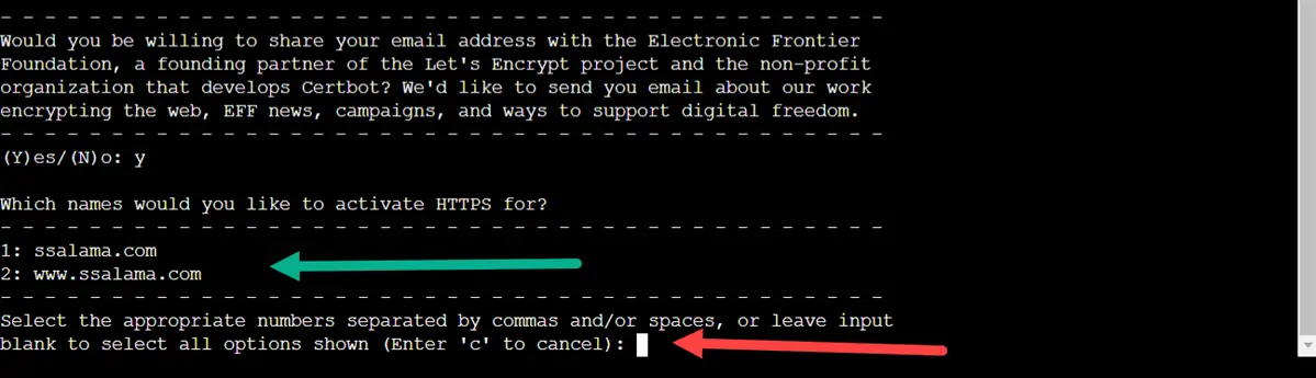 الآن يُحدد لك أسماء النطاقات التي سيقوم بتثبيت شهادة أمان لها، وكما ترى في الصورة أعلاه أنه سيُنشئ شهادة أمان للدومين من غير www وللدومين مضاف له www؛ فإذا أردت عمل شهادة أمان للدومين فقط بدون www فاكتب 1، وإذا أردت شهادة الأمان للدومين مضافًا له www فاكتب 2، لكني لم أكتب شيء لأني أريد تفعيل الإثنين معًا.