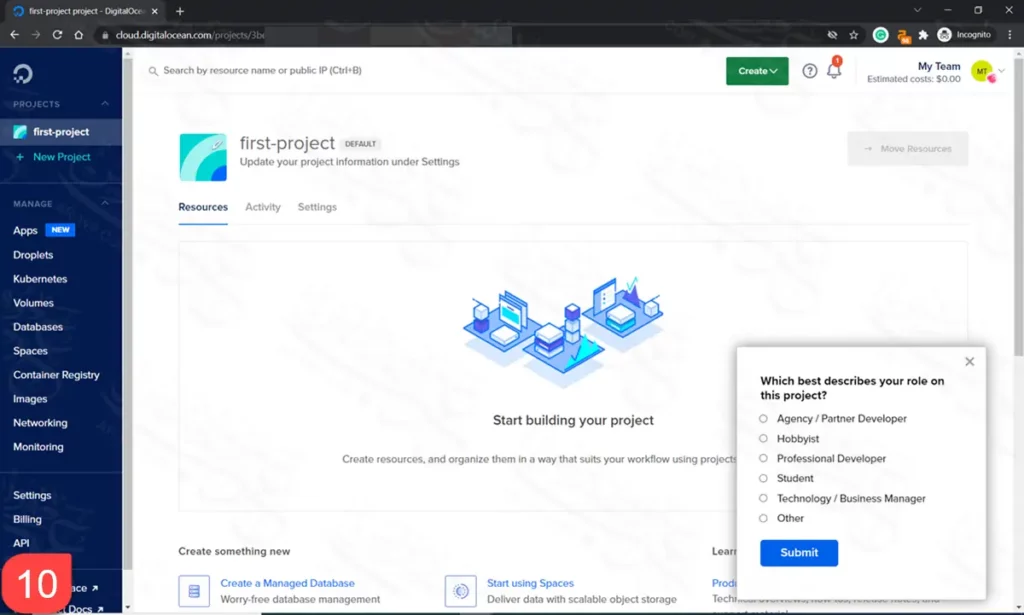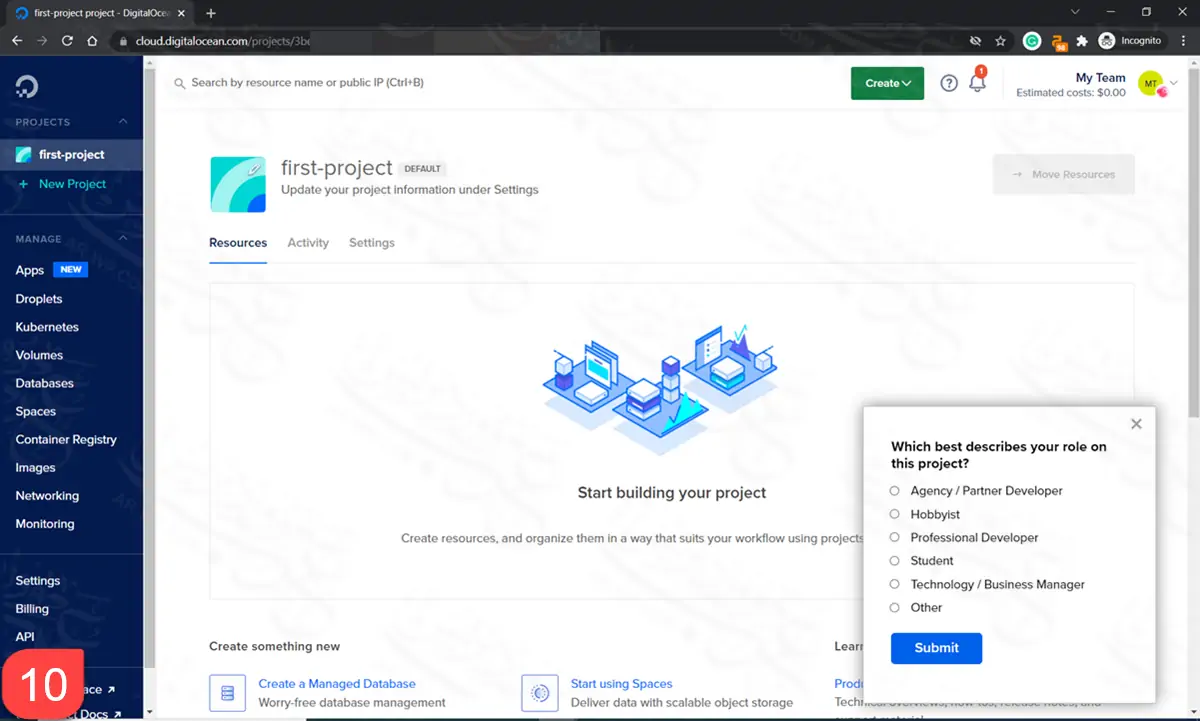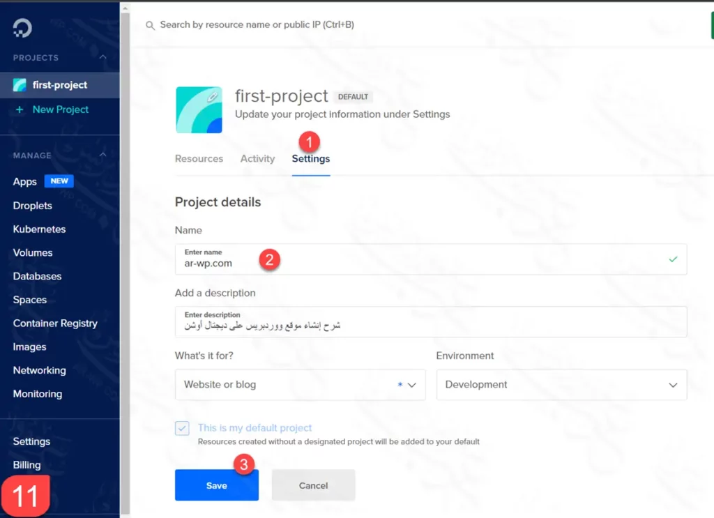 الآن أنت في لوحة تحكم ديجتال أوشن الأساسية، وقد أنشئ لك مشروع مبدئي باسم first-project- ويمكنك إعادة تسميته بالضغط على Settings.