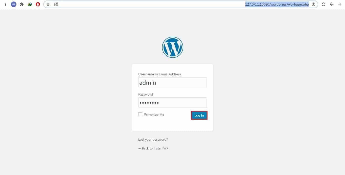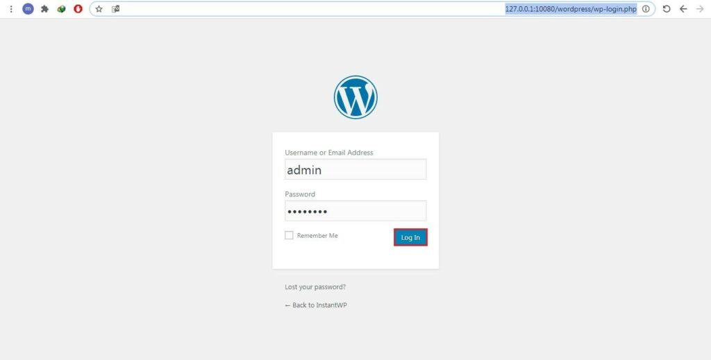 - ستفتح نافذة جديدة في المتصفح الخاص بك، وهي واجهة تسجيل الدخول الشهيرة الخاصة بالووردبريس، نقوم بتعبئة البيانات كما يلي: