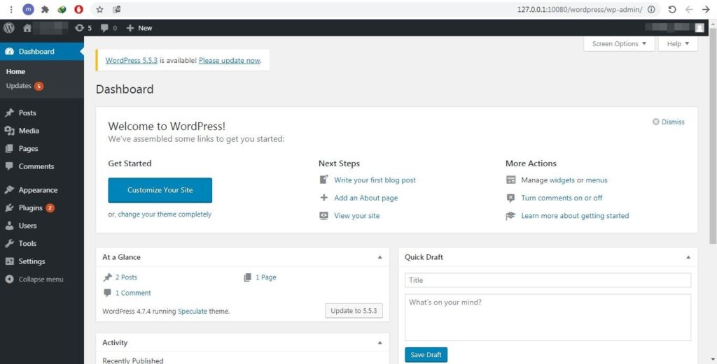 - بعد الضغط على Log In بقليل، ستظهر لوحة التحكم الخاصة بالووردبريس ويكون البرنامج يعمل بشكل صحيح 100%.