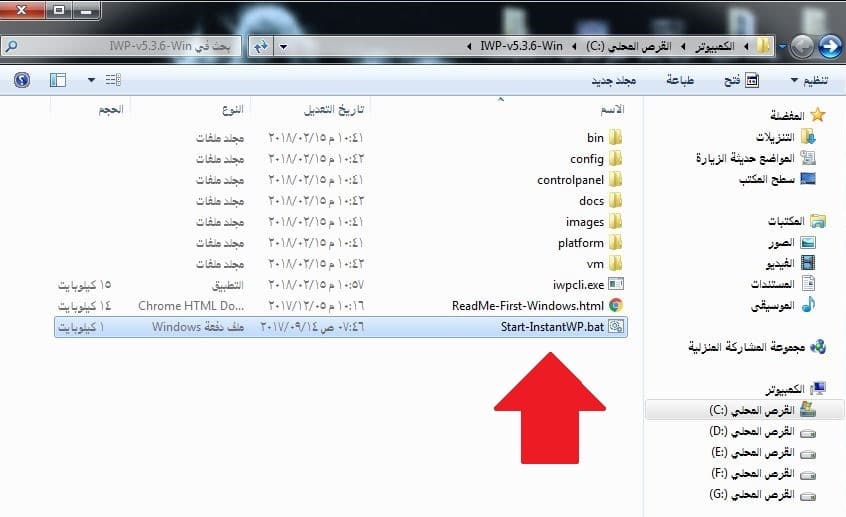 - من داخل المجلد، نقوم بالنقر المزدوج على الملف Start-InstantWP.bat لتشغيل البرنامج.