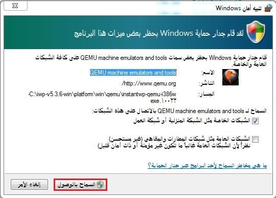 - ملاحظة: قد تظهر أثناء عملية التنصيب رسالة تنبيه أمان من Windows بخصوص الوصول إلى الشبكة، يفضل الإبقاء على الخيارات الافتراضية ثم نضغط على السماح بالوصول.